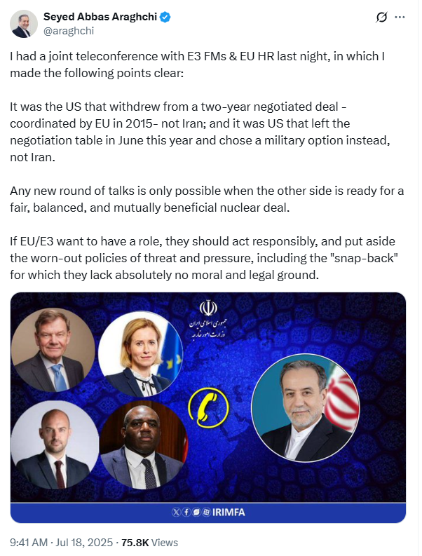 پیام سید عباس عراقچی وزیر امور خارجه در شبکه ایکس: «دیشب یک کنفرانس تلفنی مشترک با وزرای خارجه سه کشور اروپایی (E3) و مسئول سیاست خارجی اتحادیه اروپا داشتم و در آن نکات زیر را به‌روشنی بیان کردم: این ایالات متحده بود که از توافقی که طی دو سال و با هماهنگی اتحادیه اروپا در سال ۲۰۱۵ حاصل شده بود، خارج شد نه ایران؛ و این آمریکا بود که در ژوئن امسال میز مذاکره را ترک کرد و به‌جای آن گزینه نظامی را برگزید نه ایران. هر دور جدیدی از مذاکرات فقط زمانی ممکن خواهد بود که طرف مقابل برای یک توافق هسته‌ای عادلانه، متوازن و مبتنی بر منافع متقابل آمادگی داشته باشد. اگر اتحادیه اروپا و سه کشور اروپایی می‌خواهند نقشی ایفا کنند، باید مسئولانه رفتار کنند و از سیاست‌ فرسوده تهدید و فشار، از جمله تهدید به اجرای سازوکار «اسنپ بک» که فاقد هرگونه مبنای اخلاقی و حقوقی برای آن هستند، دست بردارند